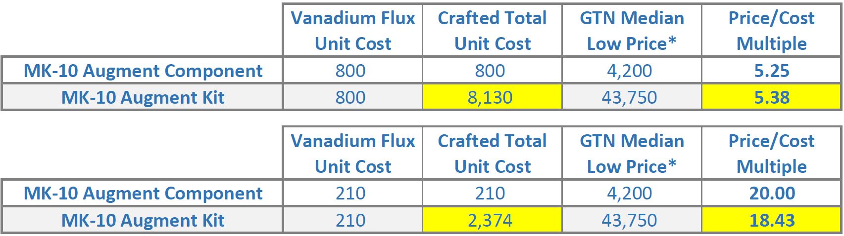 In summary, you can currently make significant profit margins by obtaining your own Vanadium Flux through crew skill missions, but you still can make very good money even if you buy the Vanadium Flux from the crew skill vendor at a unit cost of 800 credits. In both scenarios, it is not worth the time investment to craft MK-10 Augment Kits for sale on the GTN because your profits will be 20% to 25% higher selling the MK-10 Augment Components without the small additional cost of the blue materials and the time spent crafting the final product. Until the misalignment of these prices is corrected by sellers, you are literally giving away money by crafting the MK-10 Augment Kits for sale instead of farming the MK-10 Augment Components for sale.