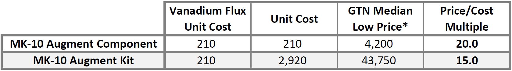 Obtaining the Vanadium Flux through running its crew skill mission reduces its unit cost to 210 credits from 800 credits, which would reduce the unit cost of the MK-10 Augment Components by the same amounts and the unit cost of the MK-10 Augment Kits to 2,920 credits from 10,000 credits, as below: