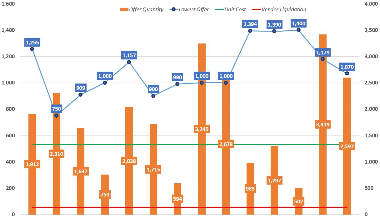 - Ruusan Crystal: lost a little more ground and is back to the high end of its previous range and in line with its overall average of an 1,100 low offer price with continued strong supply quantities.
