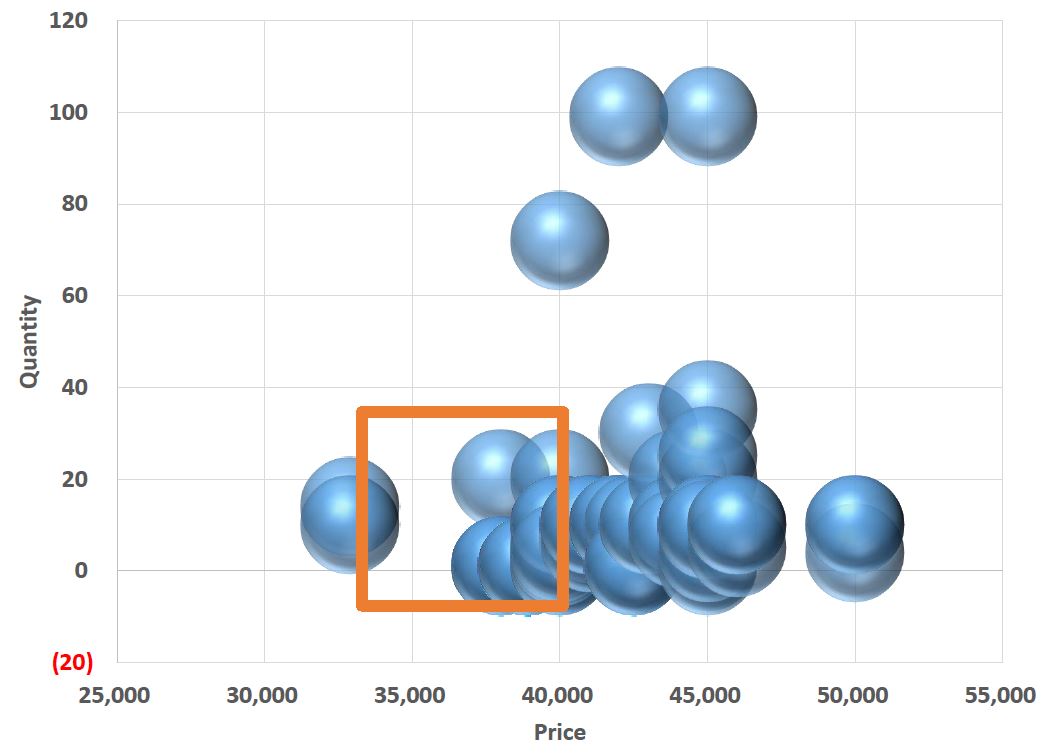 Summary: Sellers market at current lowest offer of 32,900 with nearly 8x unit cost multiple already, but supply gap exists just above this already attractive price so list above current lowest offer but below 40,000 per unit.