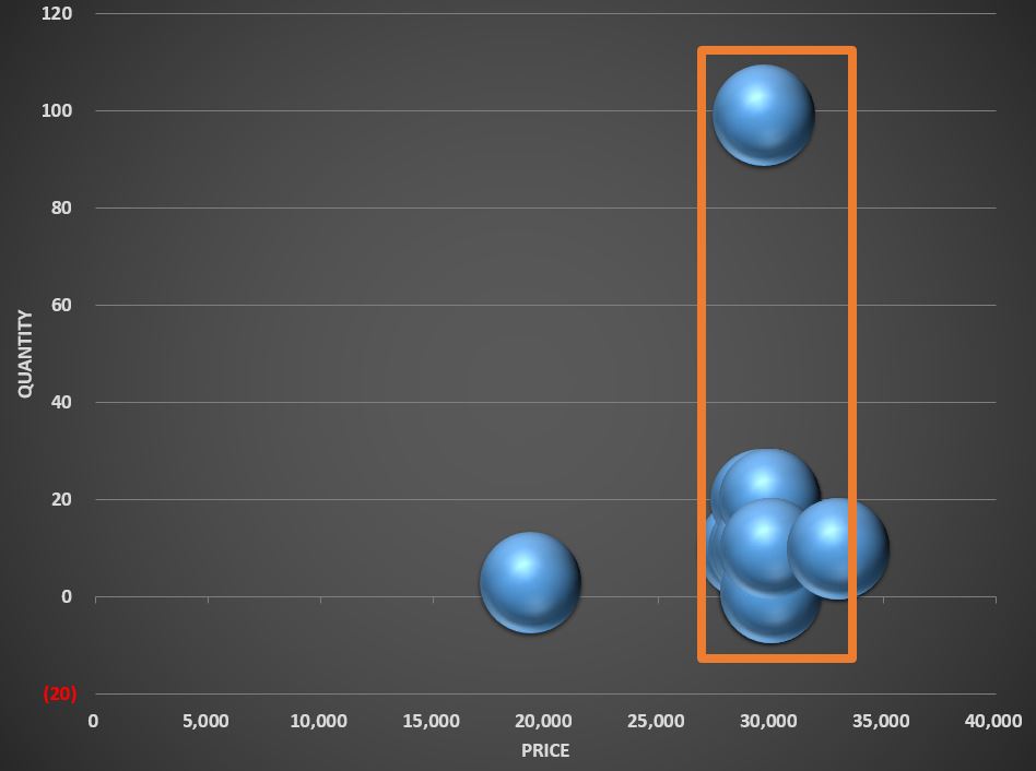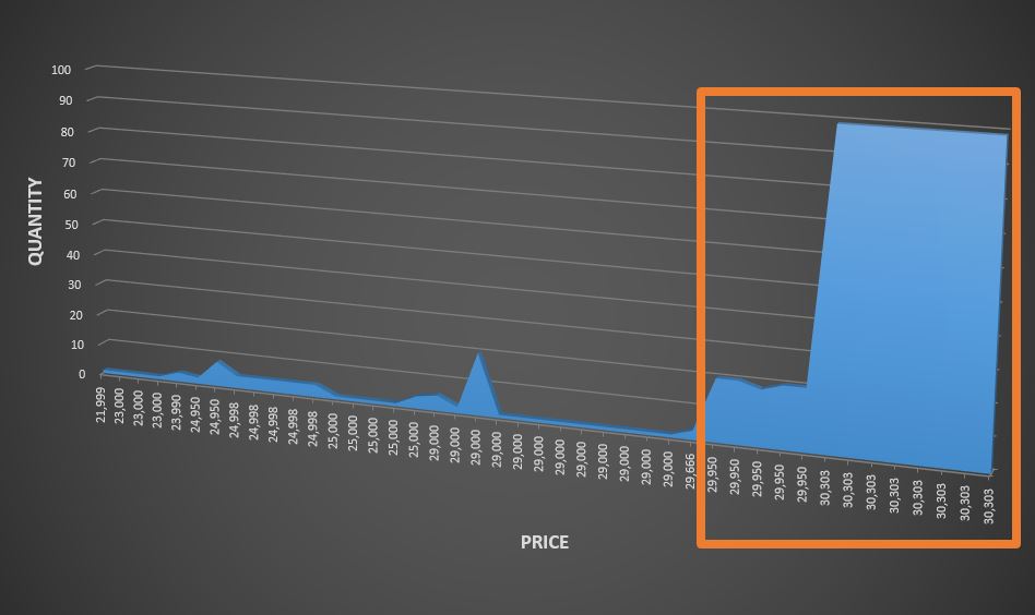 Analysis Notes: There are three units listed at 19,333 but next lot isn’t until 29,000 where 331 of the 337 listed units in a very small price range. The profit margins are very good any above 25,000 per unit and that is a historically rare price range to potentially come into play over the next 24-48 hours.