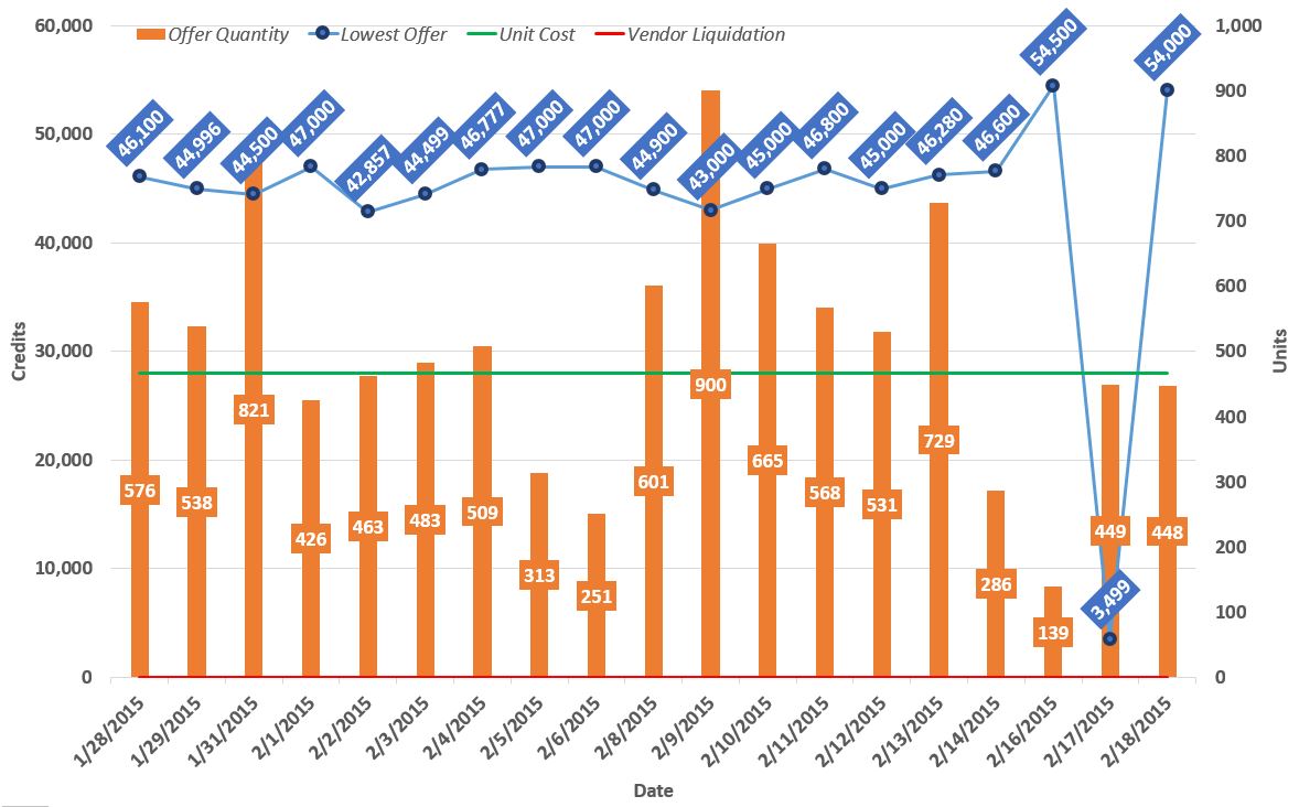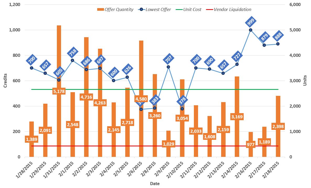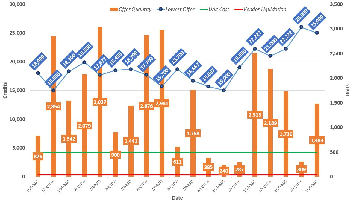 Summary: The price volatility here is off the charts, literally. We’ve seen lowest offer levels just shy of 15,000 in the past five days, but ended the day with a lowest offer under 500 per unit yesterday.