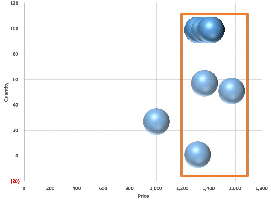 Summary: Extremely dense supply structure with more than 97% of its always significant total quantity listed currently between 320 and 400 per unit.