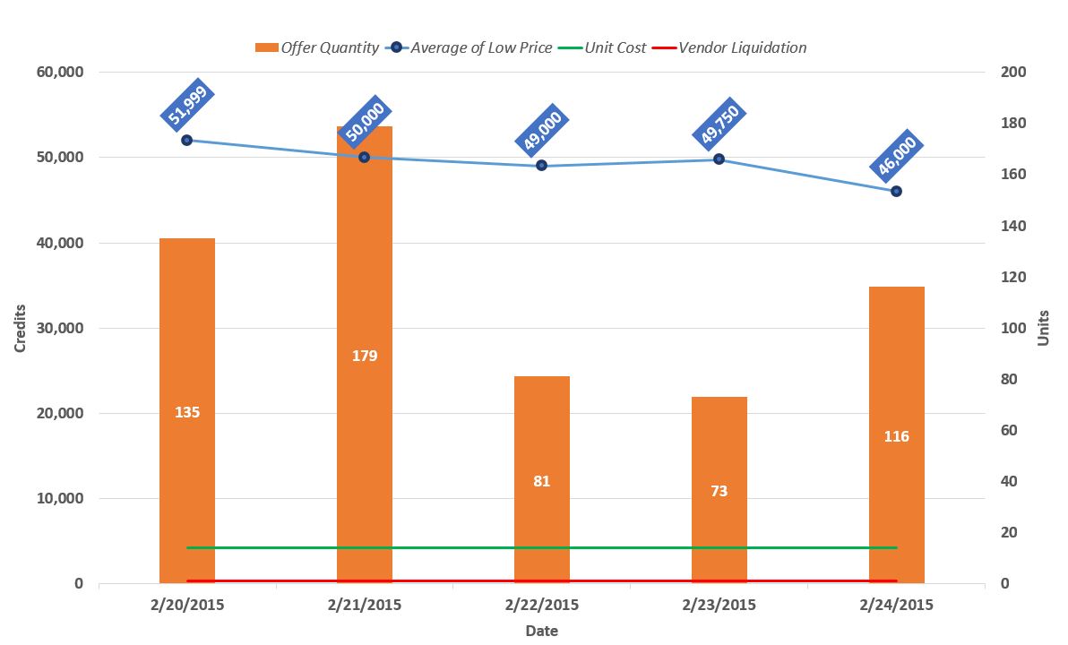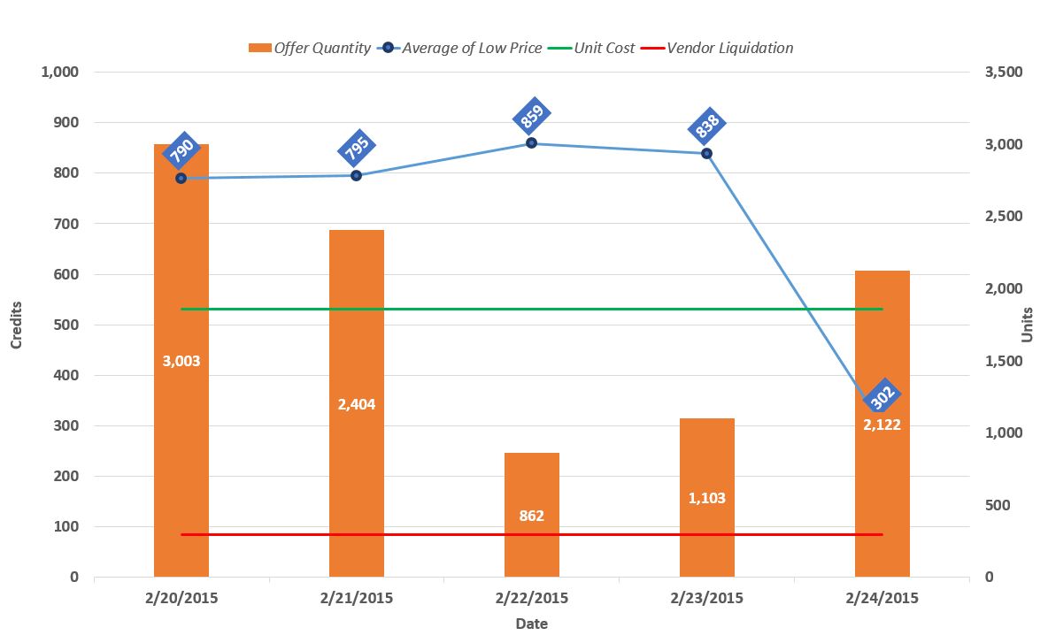 Analysis Notes: The supply distribution is informative, because there’s only a small portion of the total supply listed under 100 credits per unit. The median price is 257 credits per unit, which in this case might be a more useful metric to use since so little supply is listed near the current lowest offer and it deviates from the recent price history, while the median is in line the the prior few days of data.