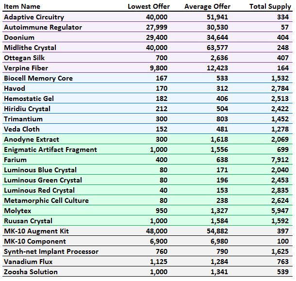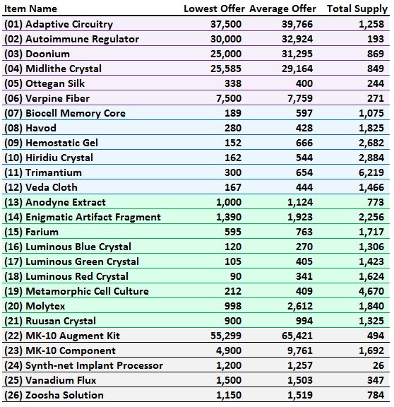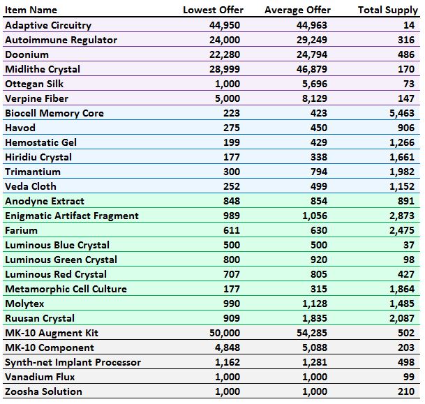 This is great. Glad to see the servers now covered includes Begeren Colony. One quick note: the average price seems to include the high mat prices that are being charged by people who are trying to get players to confuse commas with periods — maybe there is a way to filter these out? e.g.: lots of prices for adaptive circuitry on BC for numbers like 34,525,333 per unit.